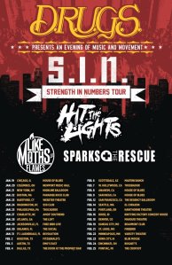 The Strength In Numbers tour (S.I.N. abbreviated) hit New York City this past weekend, and I was fortunate enough to be there for the action. The sold out show consisted of headliners Destroy Rebuild Until God Shows (D.R.U.G.S.) with openers Hit The Lights, Like Moths To Flames, Sparks The Rescue, My Arcadia, and The Action Blast. The tour line-up is very interesting because practically all the bands sound different in terms of sound! But in my opinion, it’s line-ups like that, that provide the most interesting shows.